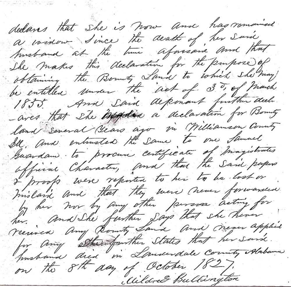 Bullington b. 1792/94 Union Co SC d. 8 Oct 1827 Lauderdale AL married: abt 1815 Mildred White b. 8 Oct 1795 Union Co SC d. aft 1850 Unkn |