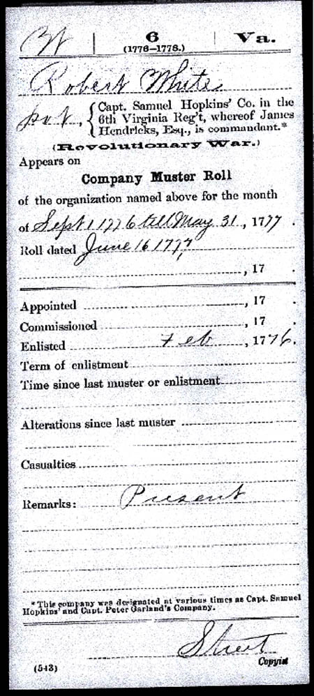 Samuel Hopkins Company 6th VA Regt. June 1777.