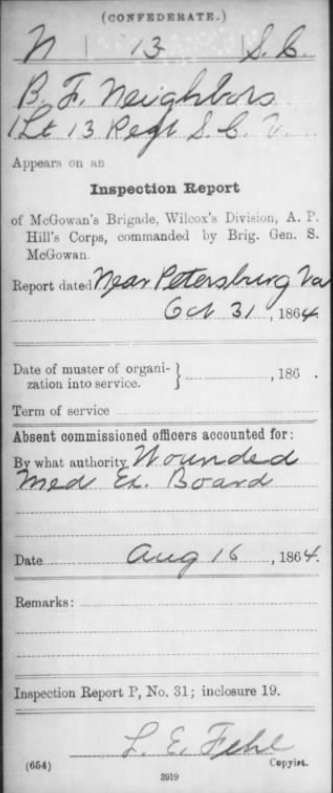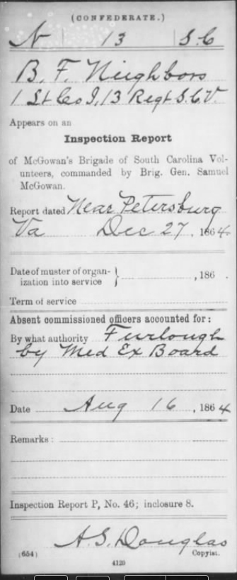Barnett b. abt 1844 Spartanburg Co SC d. Unkn Spartanburg Co SC buried Unkn (Possibly Cedar Spring Cem) married: 25 Dec 1866 Spartanburg Co SC Benjamin Franklin "Frank" Neighbors (1st Lt. & 4th Sgt Co I, 13th SC Inf Regt) (Wounded at 2nd Manassas [JBO Landrum book]) ![]() Civil War Service Records b, 2 Oct 1836 SC d. 11 Feb 1892 Spartanburg Co SC buried: Cedar Springs Cem Spartanburg Co SC