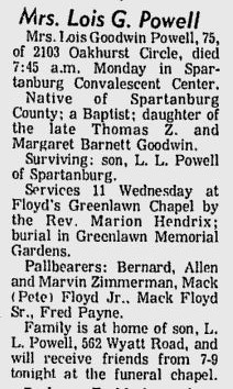 Lenora Goodwin MRS T. L. GOODWIN Obiturary Thomas Z. Goodwin Spartanburg Herald